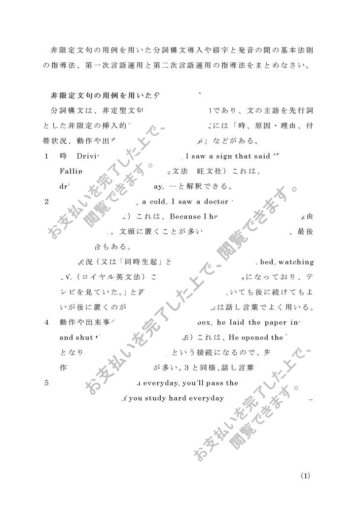 非限定文句の用例を用いた分詞構文導入や綴字と発音の間の基本法則の指導法、第一次言語運用と第二次言語運用の指導法をまとめなさい。