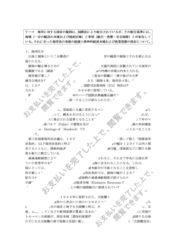テーマ 海洋に対する国家の権利は、国際法により配分されているが、その配分基準には、海域(一定の幅員の水域および海底区域)と事項(航行・漁獲・安全保障)とが並存している。それに至った海洋法の発展の経緯と排他的経済水域および漁業資源の保存について。