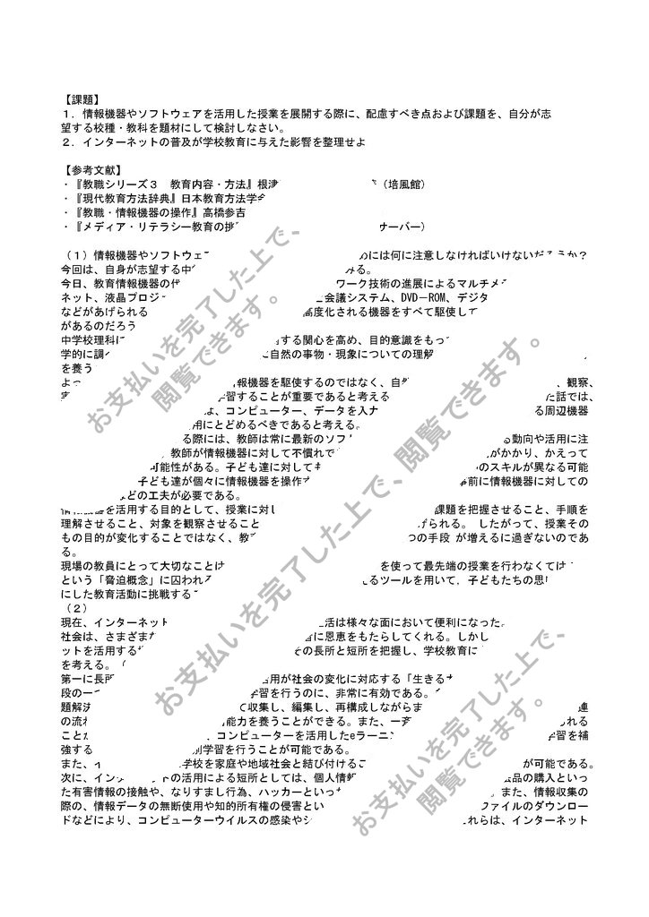 1.情報機器やソフトウェアを活用した授業を展開する際に、配慮すべき点および課題を、自分が志望する校種・教科を題材にして検討しなさい。