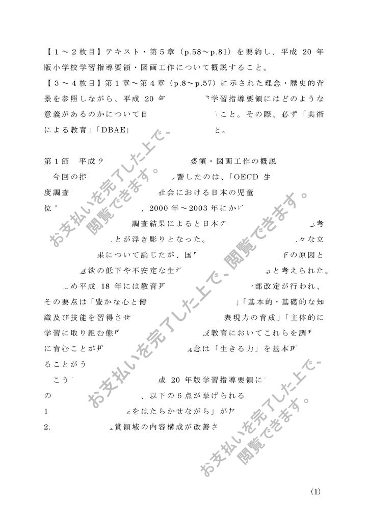 【3~4枚目】第1章~第4章(p.8~p.57)に示された理念・歴史的背景を参照しながら、平成20年度版小学校学習指導要領にはどのような意義があるのかについて自身の主張を述べること。その際、必ず「美術による教育」「DBAE」について言及すること。