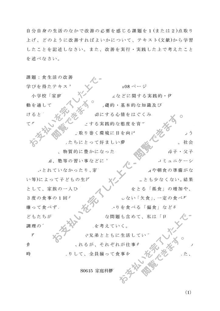 第1設題 「自分自身の生活のなかで改善の必要を感じる課題を1(または2)点取り上げ、どのように改善すればよいかについて、テキスト(文献)から学習したことを記述しなさい。また、改善を実行・実践した上で考えたことを述べなさい。」