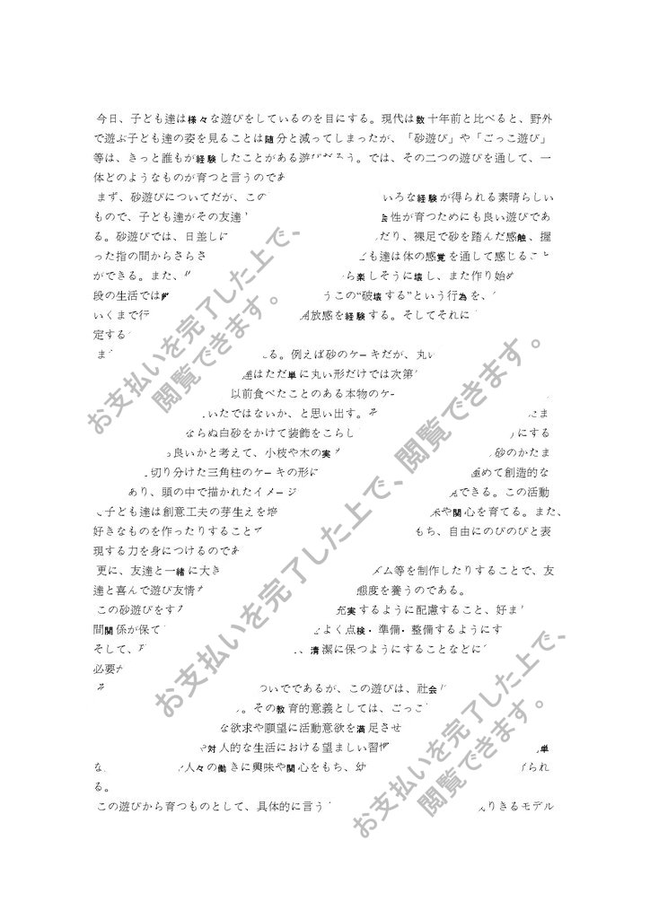 今日、子ども達は様々な遊びをしているのを目にする。現代は数十年前と比べると、野外で遊ぶ子ども達の姿を見ることは随分と減ってしまったが、「砂遊び」や「ごっこ遊び」等は、きっと誰もが経験したことがある遊びだろう。では、その二つの遊びを通して、一体どのようなものが育つと言うのであろうか。
