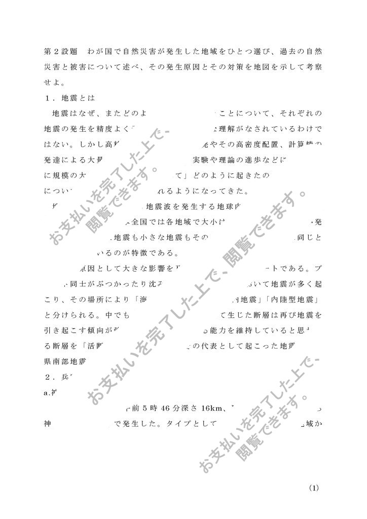 第2設題 わが国で自然災害が発生した地域をひとつ選び、過去の自然災害と被害について述べ、その発生原因とその対策を地図を示して考察せよ。
