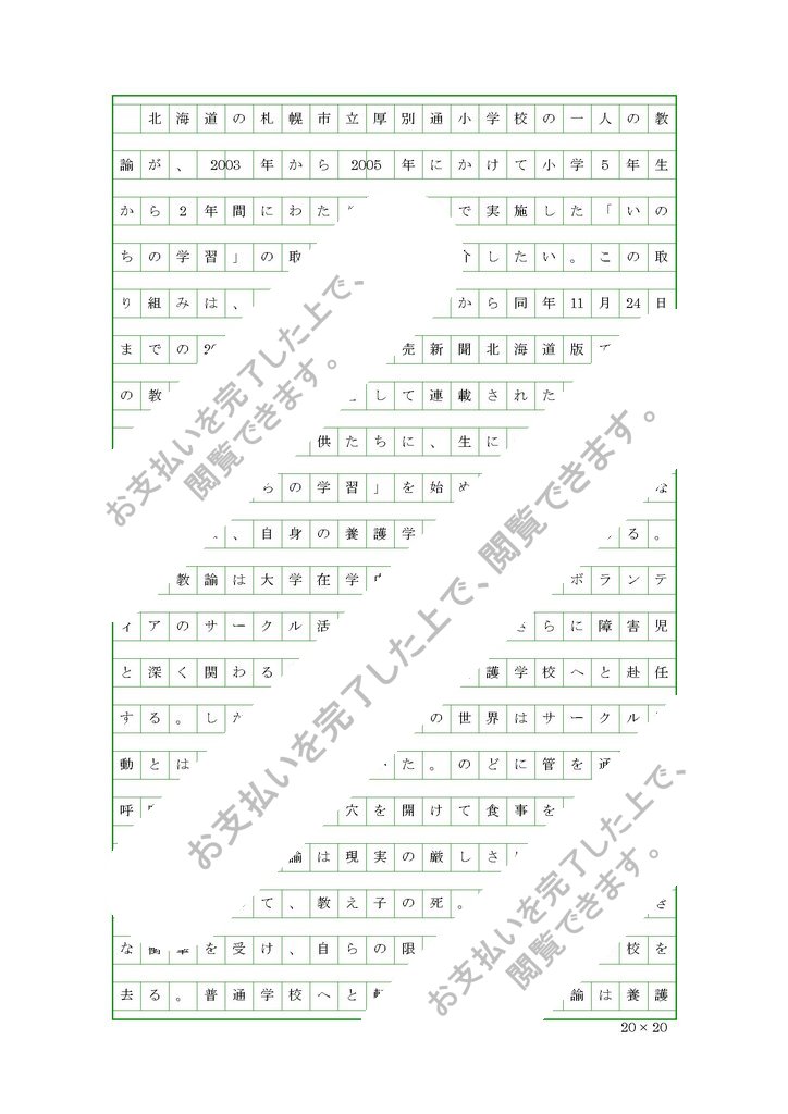 大野教諭が子供たちに、生について考えさせる「いのちの学習」を始めるきっかけとなったのは、自身の養護学校での経験にある。大野教諭は大学在学中、障害児へのボランティアのサークル活動に参加し、さらに障害児と深く関わるために卒業後養護学校へと赴任する。しかし、養護学校の世界はサークル活動とは全く異なっていた。のどに管を通して呼吸したり、胃に穴を開けて食事をする子供たち。大野教諭は現実の厳しさに打ちのめされる。そして、教え子の死。大野教諭は大きな衝撃を受け、自らの限界を知り養護学校を去る。普通学校へと転任した大野教諭は養護学校の先輩からある言葉を受けとっていた。「普通学校で障害児たちの生き様を伝えるように」。