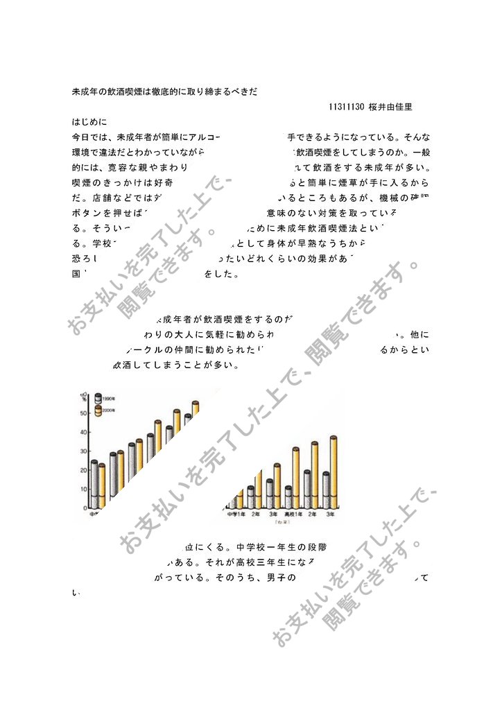 今日では、未成年者が簡単にアルコールやタバコを入手できるようになっている。そんな環境で違法だとわかっていながら何故成人しないうちに飲酒喫煙をしてしまうのか。一般的には、寛容な親やまわりの大人に気軽に勧められて飲酒をする未成年が多い。喫煙のきっかけは好奇心で、家族に喫煙者がいると簡単に煙草が手に入るからだ。店舗などでは対策として年齢確認をしているところもあるが、機械の確認ボタンを押せば良いだけのものなどあまり意味のない対策を取っている店もある。そういった未成年者を取り締まるために未成年飲酒喫煙法というものがある。学校では保健体育の授業の一環として身体が早熟なうちからの飲酒喫煙の恐ろしさを教えてはいるが、いったいどれくらいの効果があるのだろうか?他国との法の違いも含めて考察をした。