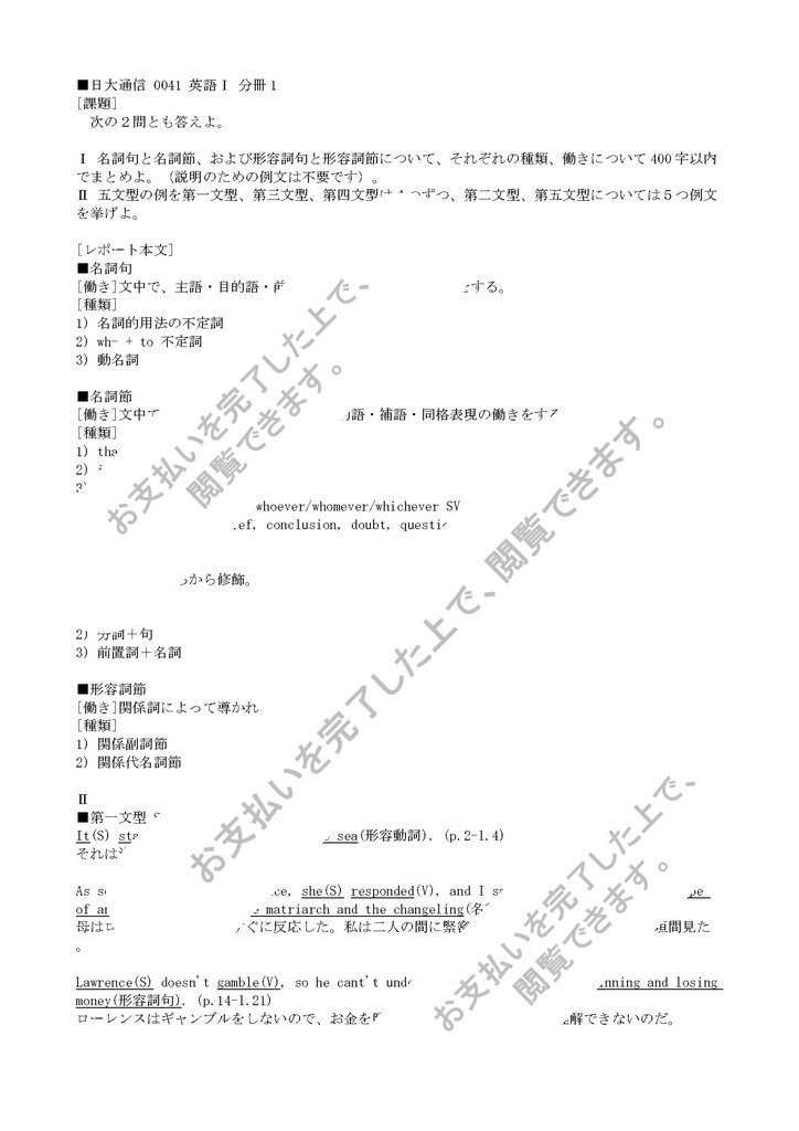 Ⅰ 名詞句と名詞節、および形容詞句と形容詞節について、それぞれの種類、働きについて400字以内でまとめよ。(説明のための例文は不要です)。
