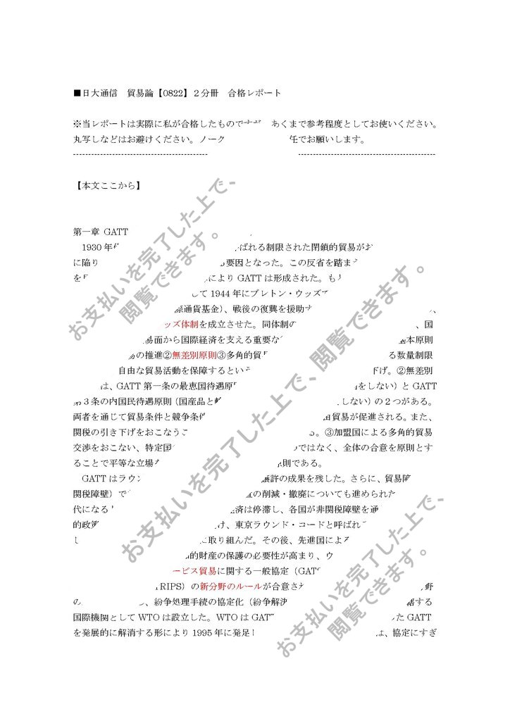 ■日大通信 貿易論【0822】2分冊 合格レポート