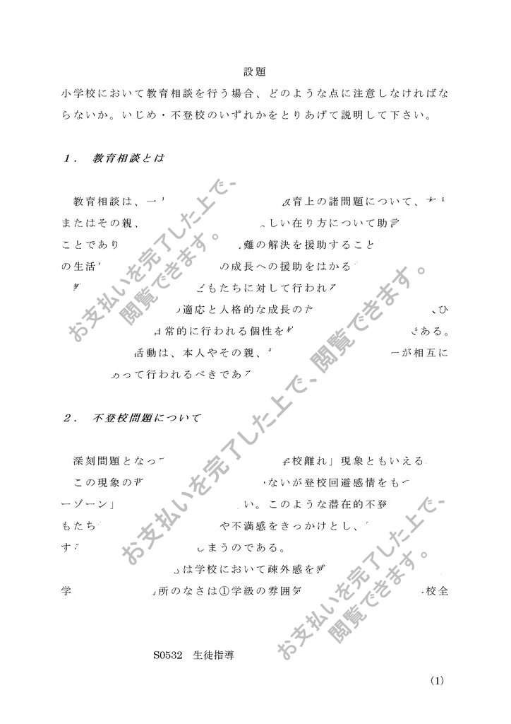 設題:小学校において教育相談を行う場合、どのような点に注意 しなければならないか。いじめ・不登校のいずれかをとりあ げて説明して下さい。