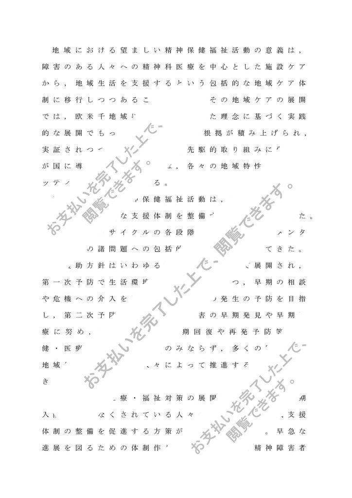 地域における望ましい精神保健福祉活動の意義は,障害のある人々への精神科医療を中心とした施設ケアから,地域生活を支援するという包括的な地域ケア体制に移行しつつあることにある。その地域ケアの展開では,欧米千地域において培われた理念に基づく実践的な展開でもって,その有効性の根拠が積み上げられ,実証されつつある。それらの先駆的取り組みに倣い我が国に導入される場合には,各々の地域特性へのフィッティングが必要となる。