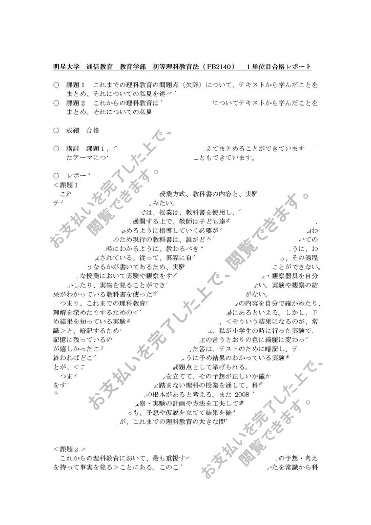 明星大学 通信教育 教育学部 初等理科教育法(PB2140) 1単位目合格レポート