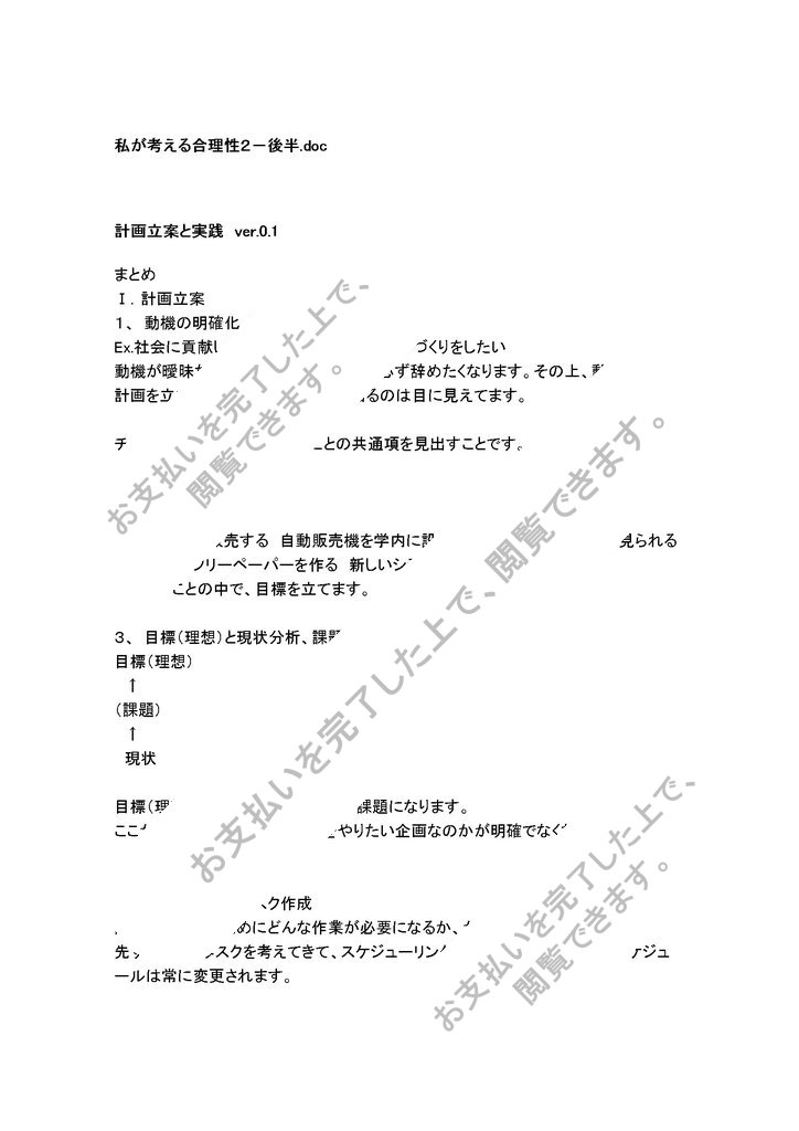 まとめ Ⅰ.計画立案 1、 動機の明確化 (何をやりたいか) Ex.社会に貢献したい、企業と組みたい、ものづくりをしたい 動機が曖昧だと作業が進行する段階で必ず辞めたくなります。その上、動機とは違う計画を立ててしまうと最悪な結果に陥るのは目に見えてます。 チーム内でお互いにやりたいことの共通項を見出すことです。 2、 目標の策定 Ex. Tシャツを販売する 自動販売機を学内に設置する 休講情報を携帯で見られるようにする フリーペーパーを作る 新しいシラバスを作る 等等。 やりたいことの中で、目標を立てます。 3、 目標(理想)と現状分析、課題の策定。 目標(理想) ↑ (課題) ↑ 現状 目標(理想)と現実をどう埋めるかが課題になります。 ここがぐちゃぐちゃだと、一体何をやりたい企画なのかが明確でなくなります。 4、 スケジュール・タスク作成 課題を克服するためにどんな作業が必要になるか、がタスクになります。 先ず、必要なタスクを考えてきて、スケジューリングをしますが、状況に応じスケジュールは常に変更されます。 5...