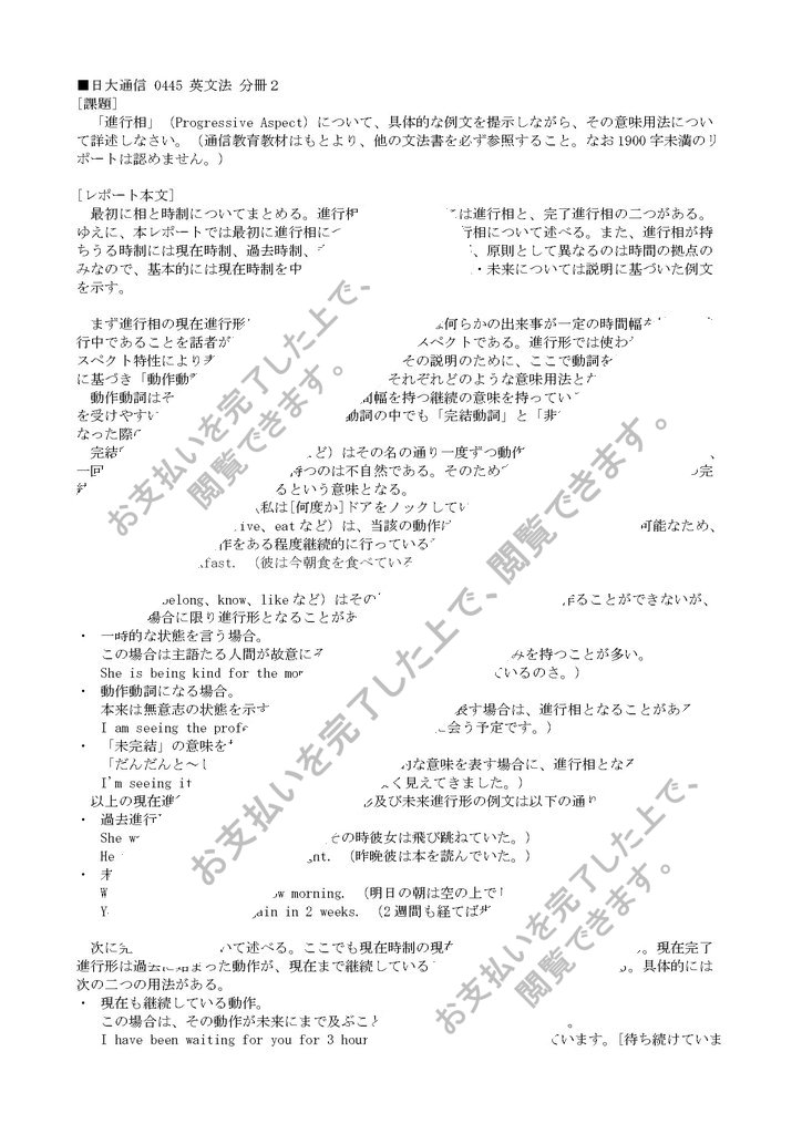 「進行相」(Progressive Aspect)について、具体的な例文を提示しながら、その意味用法について詳述しなさい。(通信教育教材はもとより、他の文法書を必ず参照すること。なお1900字未満のリポートは認めません。)
