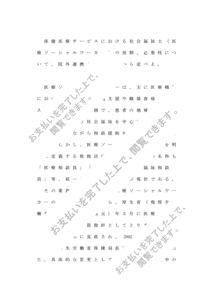 <課題名>「保健医療サービスにおける社会福祉士(医療ソーシャルワーカー)の役割、必要性について、院外連携という視点から述べよ。」