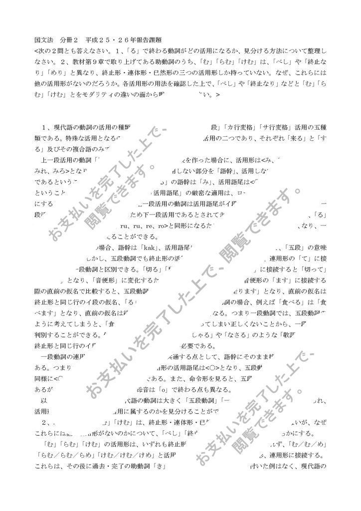 課題 次の2問とも答えなさい。1、「る」で終わる動詞がどの活用になるか、見分ける方法について整理しなさい。2、教材第9章で取り上げてある助動詞のうち、「む」「らむ」「けむ」は、「べし」や「終止なり」「めり」と異なり、終止形・連体形・已然形の三つの活用形しか持っていない。なぜ、これらには他の活用形がないのだろうか。各活用形の用法を確認した上で、「べし」や「終止なり」などと「む」「らむ」「けむ」とをモダリティの違いの面から明らかにしなさい。