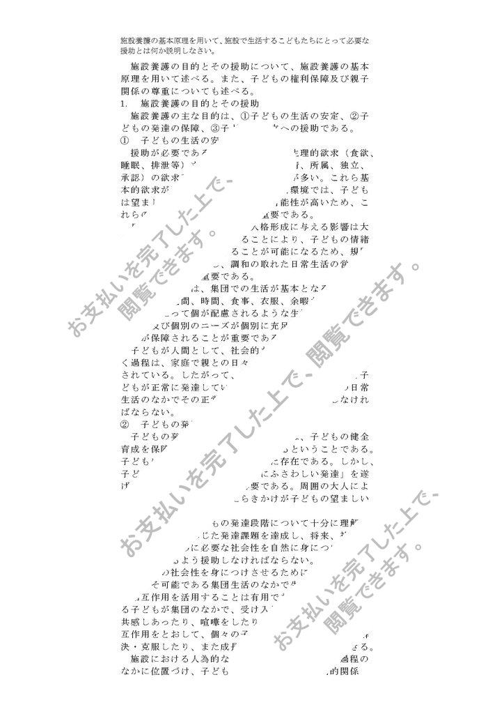 施設養護の目的とその援助について、施設養護の基本原理を用いて述べる。また、子どもの権利保障及び親子関係の尊重についても述べる。