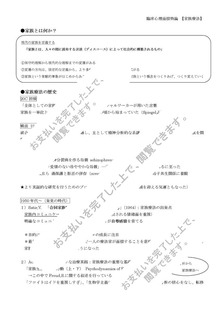 家族心理学の発表レジュメです。家族療法の歴史、各派の特徴、家族療法の概念などについて説明しています。