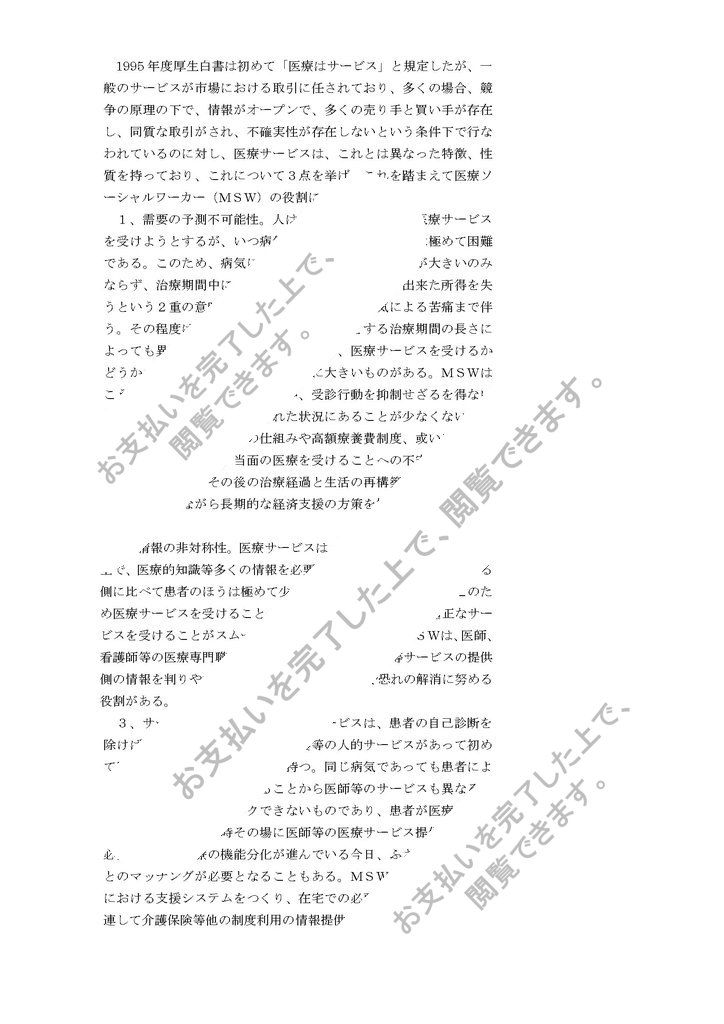 1995年度厚生白書は初めて「医療はサービス」と規定したが、一般のサービスが市場における取引に任されており、多くの場合、競争の原理の下で、情報がオープンで、多くの売り手と買い手が存在し、同質な取引がされ、不確実性が存在しないという条件下で行なわれているのに対し、医療サービスは、これとは異なった特徴、性質を持っており、これについて3点を挙げ、これを踏まえて医療ソーシャルワーカー(MSW)の役割について述べる。