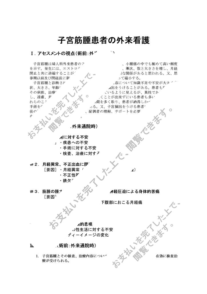 子宮筋腫は婦人科外来患者の3~4%と言われており、小腫瘍の中でも極めて高い頻度を示す。発生には、エストロゲンが大きく関与しており、漸次、数と大きさを増し、月経閉止と共に退縮することがある。これは卵巣機能と蜜接な関係があると思われる。又、思春期以前及び閉経後に新たに発生せず、自然閉経によって縮小する。 子宮筋腫と診断された患者は、その病態、治療内容について知識不足や不安が大きく症状、大きさ、年齢によっては手術を行い、子宮摘出をうけることがある。患者も医師よりその病態、治療内容について説明され納得しているように見えるが、異性である医師に対し、遠慮、羞恥心などにより十分な話を聞くことが出来ずにいる患者も多い。看護者はこれらのことも考慮し、患者と話し合う時間を多く取り、患者が納得しかつ安心して治療や手術を受けられるようにする必要がある。又、子宮摘出をうける患者は女性性の喪失、術後の性生活に対する不安が大きく、配偶者の理解、サポ-トを必要とするため、家族を含めて援助をしていく必要がある。