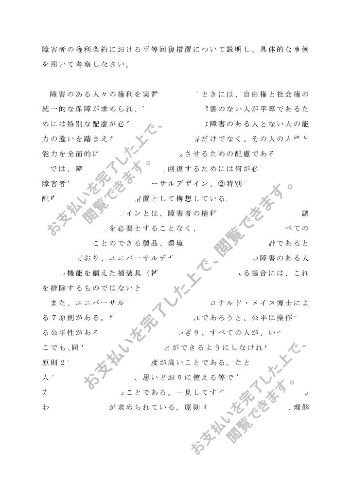 設題「障害者の権利条約における平等回復措置について説明し、具体的な事例を用いて考察しなさい。」