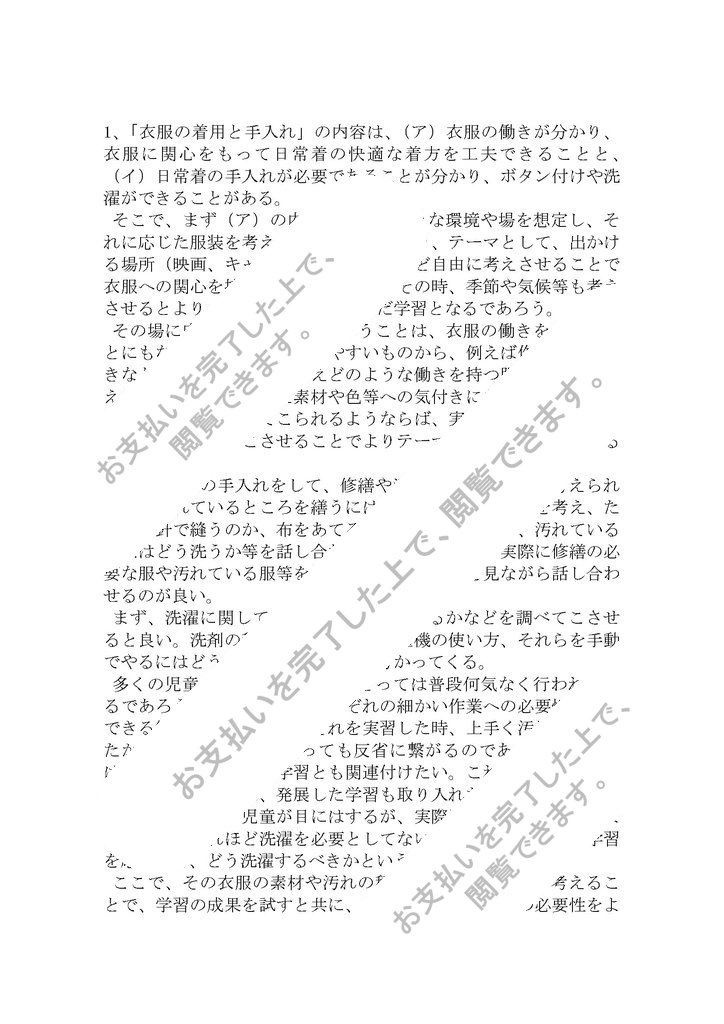1、「衣服の着用と手入れ」の内容は、(ア)衣服の働きが分かり、衣服に関心をもって日常着の快適な着方を工夫できることと、(イ)日常着の手入れが必要であることが分かり、ボタン付けや洗濯ができることがある。