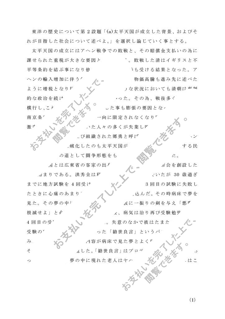 東洋の歴史について第2設題「(a)太平天国が成立した背景、およびそれが目指した社会について述べよ。」を選択し論じていく事とする。