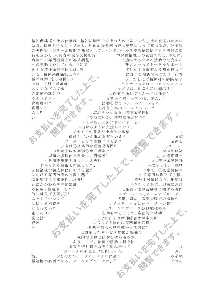 精神保健福祉士の仕事は、精神に障がいを持つ人の相談にのり、社会復帰のための助言、指導を行うことである。具体的な業務内容は現場によって異なるが、他業種の専門家とのチーム展開を基本として、メンタルヘルスや福祉に関する専門的な知識を生かし、利用者の生活支援を行うことが精神保健福祉士の役割である。さらに、病院外の専門機関との連絡調整も行い、日常生活に適応するための援助や社会参加への手助けをしていき、心に病を抱えた人の一番の味方となってトータルサポートをする精神保健福祉士は、医療現場と地域社会の橋渡しをする重要な役割を担っている。精神保健福祉士の主な業務は、精神障がい者に対する相談援助であり、他業種の専門 家と連携して仕事にあたるのが特徴である。たとえば精神科の病院などでは、医師や看護師、作業療法士や臨床心理士などとチームを組んでメンタルヘルスケアなどの支援を行い、一方、社会復帰施設などでは、日常生活に適応するための訓練や就労前トレーニングなどに協力し、作業を通してスムーズに社会参加できるようサポートをするなど連携をしながら業務に携わっている。また、最近では教育現場のメンタルヘルスに関する相談援...