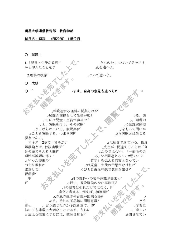 1.「児童・生徒が歓迎する理科の授業とはどういうものか」についてテキストから学んだことをまとめ、それについて の私見を述べよ。