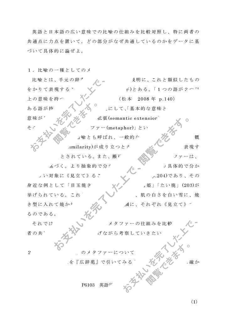 P6103英語学概論の合格レポート第2設題です。設題の難易度が高く、文字数以内に論理的にまとめるのに苦心した自信作です。コメントとして、文献をふまえ適切に論じていると高評価されました。参考文献は学校指定の教科書以外にも3冊の文献を使い、レポートに必要なデータ収集から丁寧に行いました。設題の指示どおりに、データの比較をしながらそれに基づいて論じています。また、なるべく多くのデータを例として示しながら具体的に論じるよう工夫しました。ぜひ参考になさって下さい。