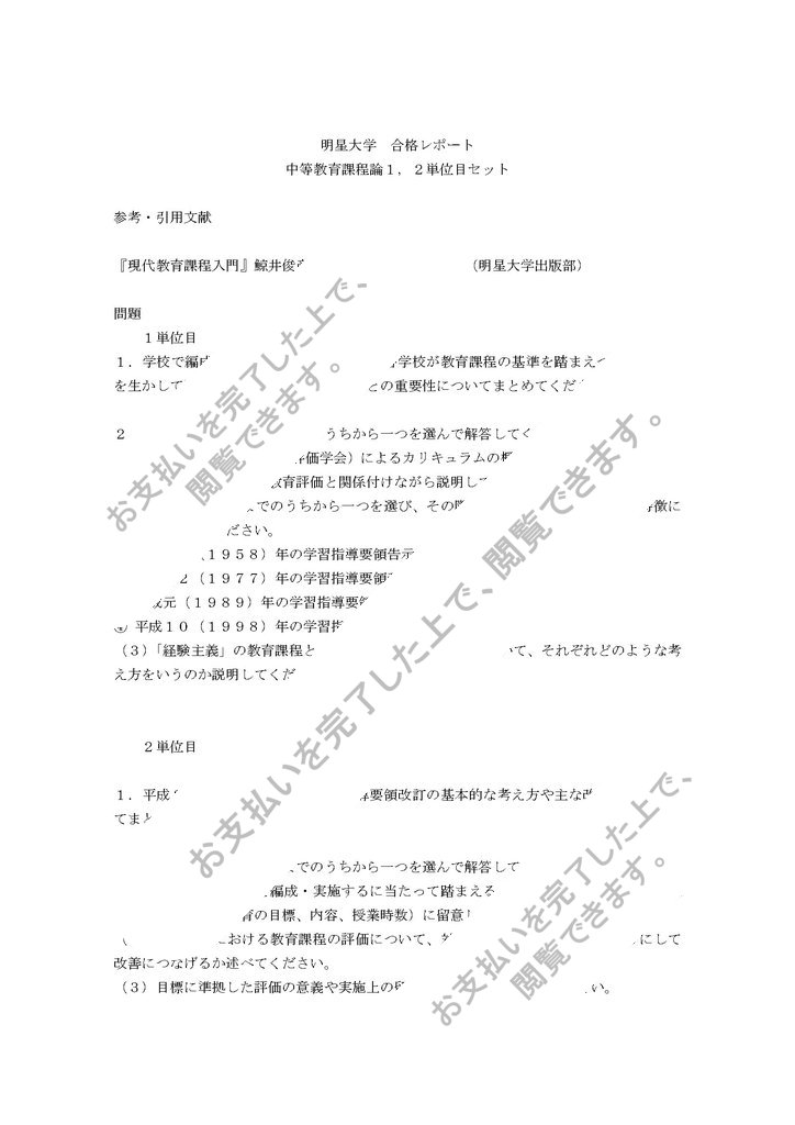 明星大学、中等教育課程論1,2単位目の合格レポートセットです。