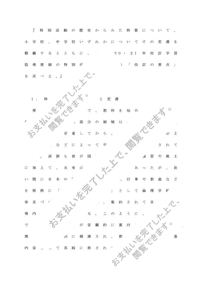 『特別活動の歴史からみた特質について、小学校、中学校いずれかについてその変遷を概観するとともに、平成20・21年改訂学習指導要領の特別活動に関する「改訂の要点」を述べよ。』