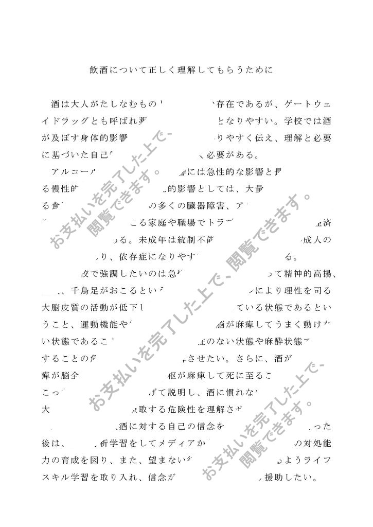酒は大人がたしなむものとして身近な存在であるが、ゲートウェイドラッグとも呼ばれ薬物乱用の入り口となりやすい。学校では酒が及ぼす身体的影響・社会的影響をわかりやすく伝え、理解と必要に基づいた自己管理ができるよう導く必要がある。