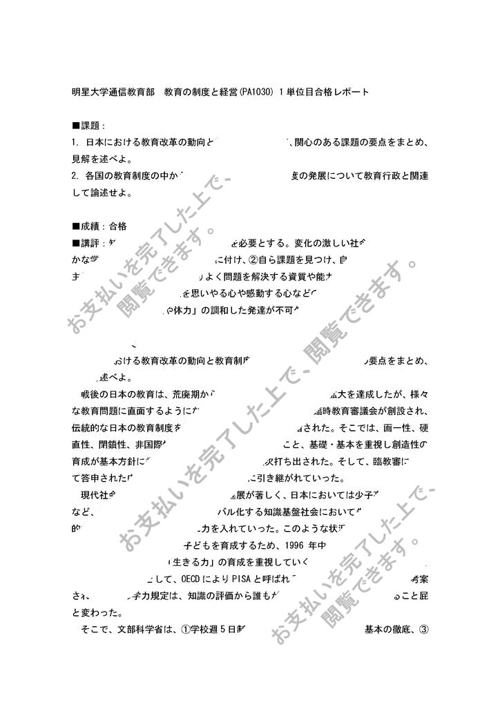■■■2014年度 明星大学 通信教育部 教育の制度と経営(PA1030) 1単位目 合格レポート■■■