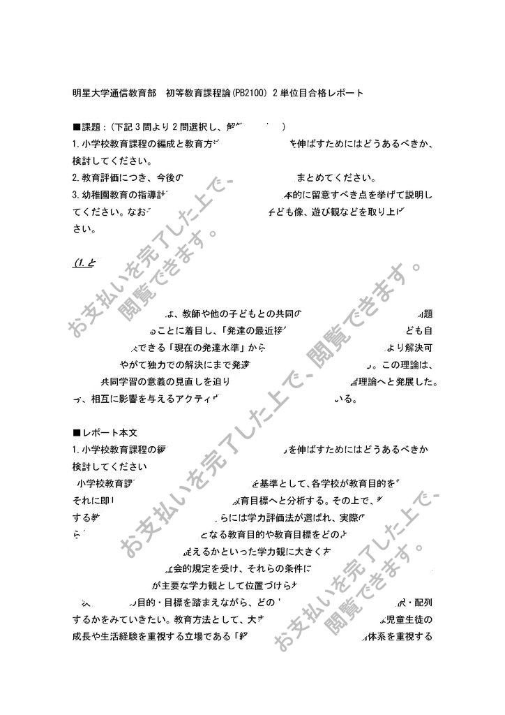 明星大学通信教育部 初等教育課程論(PB2100) 2単位目合格レポート