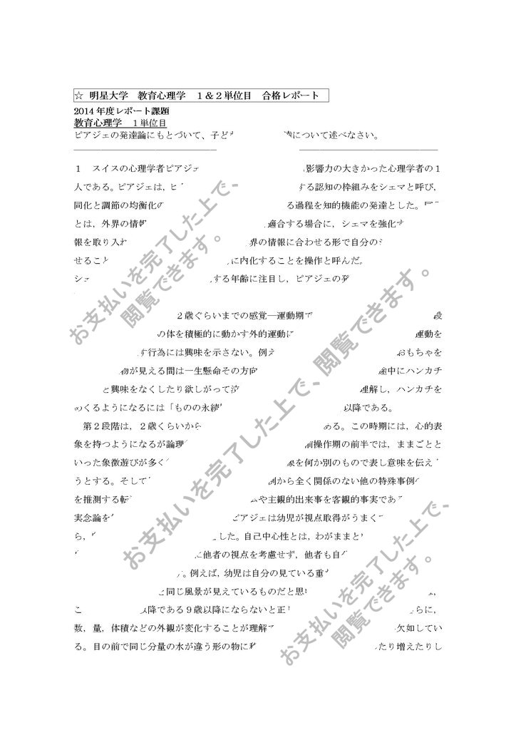 ご観覧頂きありがとうございます。 明星大学の2014年教育心理学 1&2単位目合格レポートです。 良い評価をいただきました。参考になれば幸いです。 よろしくお願いします。