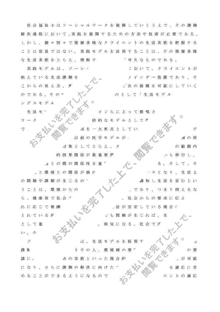 生活モデルとは、ジャーメインらによって提唱され、ソーシャルワーク実践展開において中核的なモデルとして理解されているもので、人と環境の交互作用を一大焦点としている。これは、生活モデルがとりいれられる以前の医学モデルが、クライエントを問題の原因を有している対象としてとらえ、クライエントという個の範囲内における直接的因果関係が最重要視されてきたモデルから移行し、個人と環境との間の関係性を重要視したモデルである。そして、その個人と環境との関係が...