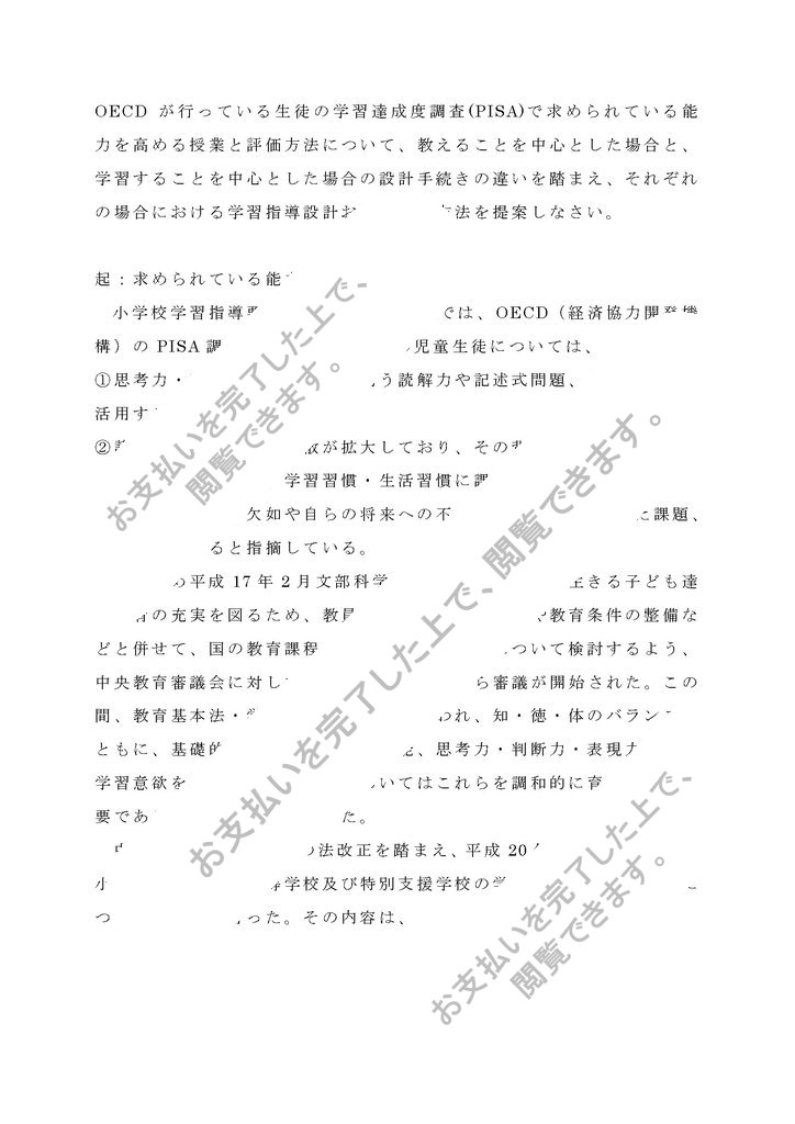 OECDが行っている生徒の学習達成度調査(PISA)で求められている能力を高める授業と評価方法について、教えることを中心とした場合と、学習することを中心とした場合の設計手続きの違いを踏まえ、それぞれの場合における学習指導設計および評価方法を提案しなさい。