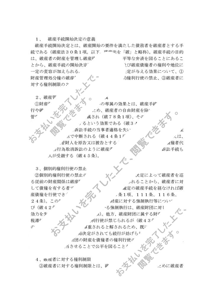 ①財産管理処分権の破産管財人への専属の効果とは、破産手続きの円滑な遂行や破産者の財産の減損防止のため、破産者の自由財産を除いた全ての財産の管理処分権が破産管財人に専属され(破78条1項)、その財産は債権者への清算のため破産財団を構成するという効果である(破34条1項)。従って、破産者は破産財団に関する訴訟手続の当事者適格を失い、進行中の訴訟手続は破産手続開始決定の時点で中断される(破44条1項)。破産財団に関する訴えは、原則として破産管財人を原告又は被告とする必要があり...