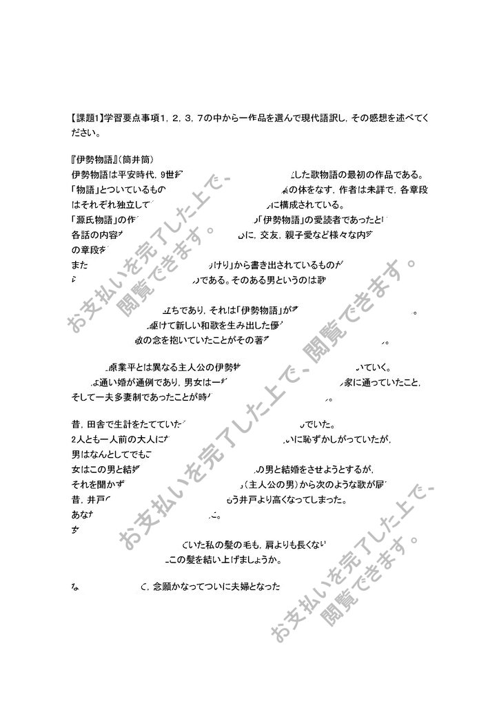 【課題1】学習要点事項1,2,3,7の中から一作品を選んで現代語訳し,その感想を述べてください。