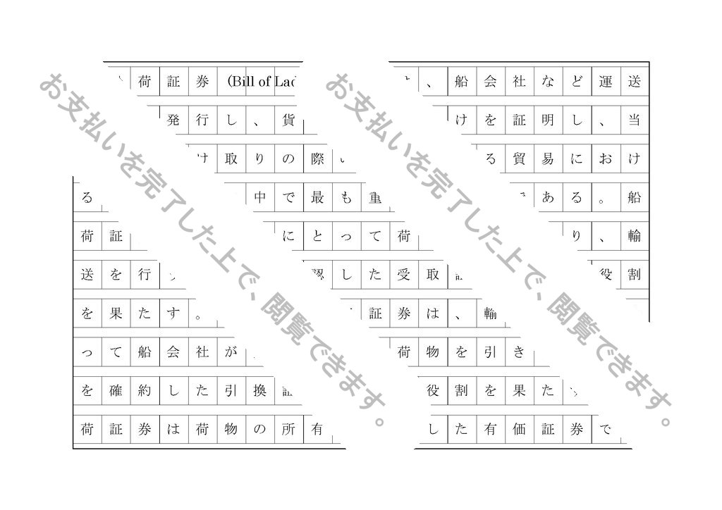 〇船荷証券(Bill of Lading,B/L)とは、船会社など運送業者が発行し、貨物の引き受けを証明し、当該貨物受け取りの際の依拠とする貿易における船積書類の中で最も重要な書類である。船荷証券は船会社にとって荷物を受け取り、輸送を行うことを確認した受取証としての役割を果たす。また、船荷証券は、輸入業者にとって船会社が陸揚げ港で荷物を引き渡すことを確約した引換証としての役割を果たす。船荷証券は荷物の所有権を示した有価証券であり、裏書(Endorsement)によって荷物の所有権を譲渡することが可能である。