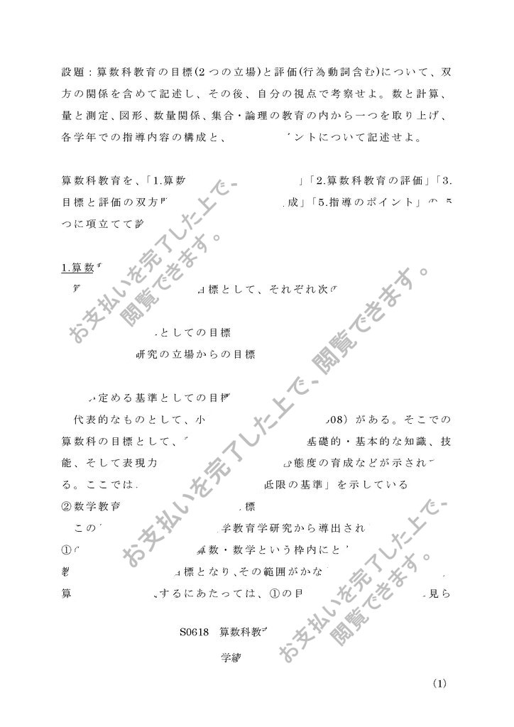 【設題】算数科教育の目標(2つの立場)と評価(行為動詞含む)について、双方の関係を含めて記述し、その後、自分の視点で考察せよ。数と計算、量と測定、図形、数量関係、集合・論理の教育の内から一つを取り上げ、各学年での指導内容の構成と、指導のポイントについて記述せよ。