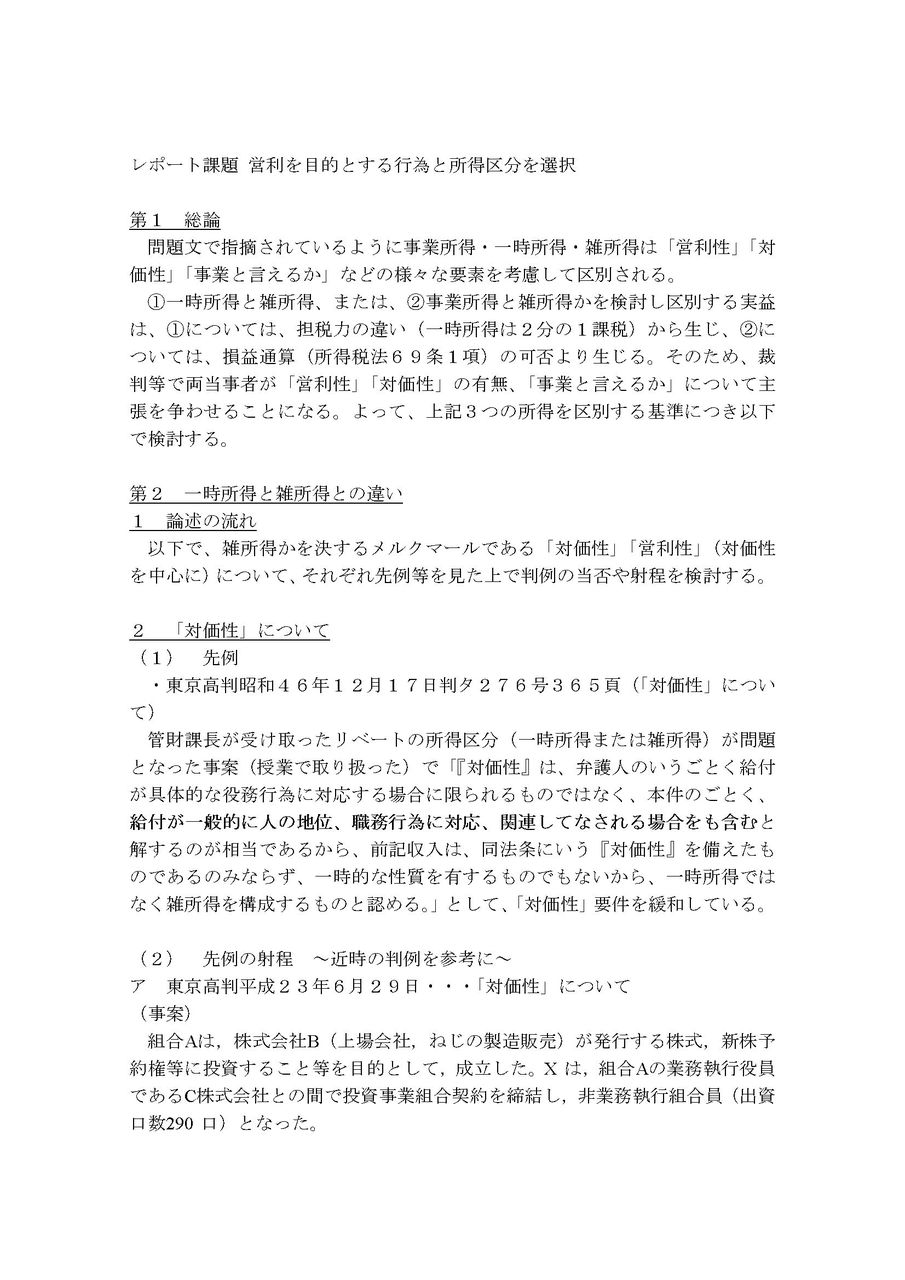 (判断主体が異なるが)授業で取り扱った「裁決事例集NO75,229頁(新株予約権の行使に係る経済的利益)との関係を検討すると、同裁決における請求人は本件におけるF社(組合Aの業務執行役員)のような実際に役務を提供する(予定)者であることから、同事例と比較すると、実際の事業に何らかの関与をしていたわけではない本件の非業務執行組合員Xでも「役務の提供」ありとした点で、本件はより「対価性」の範囲を広げていると言える。