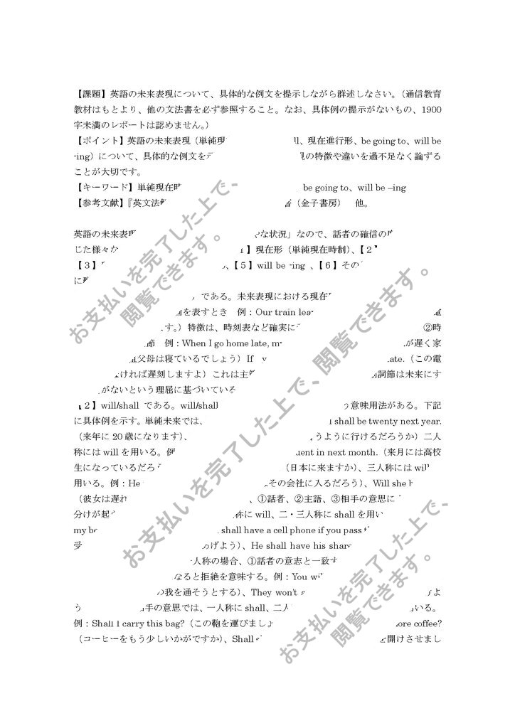 【課題】英語の未来表現について、具体的な例文を提示しながら群述しなさい。(通信教育教材はもとより、他の文法書を必ず参照すること。なお、具体例の提示がないもの、1900字未満のレポートは認めません。)