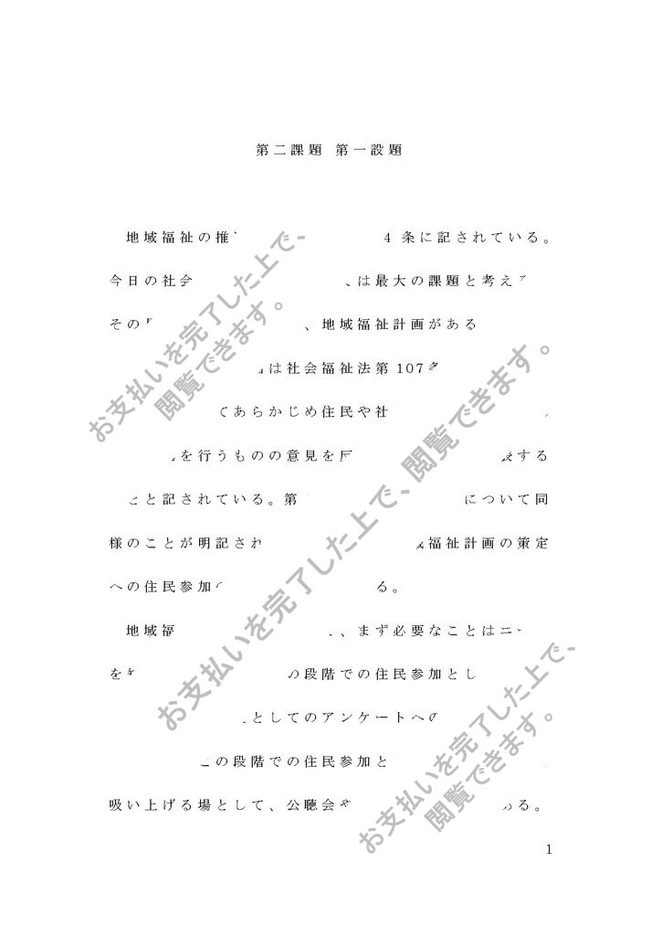 課題名「市町村等の地方自治体が地域福祉計画を策定する際、どのような住民参加の方法が考えられるか、あなたが居住している地域での実情に合わせて記述しなさい」