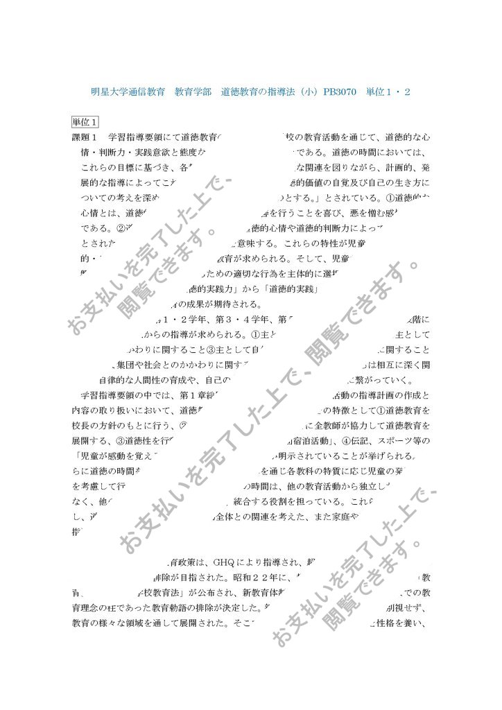 ご観覧頂きありがとうございます。 明星大学の2015年レポート道徳教育の指導法(小)1・2単位目の合格レポートです。苦戦しましたが、なんとかまとめることができました。 評価は良かったです 。