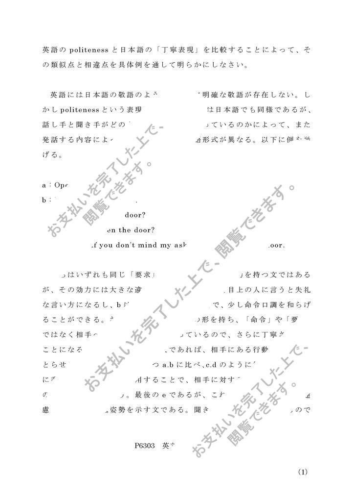 設問:英語のpolitenessと日本語の「丁寧表現」を比較することによって、その類似点と相違点を具体例を通して明らかにしなさい。