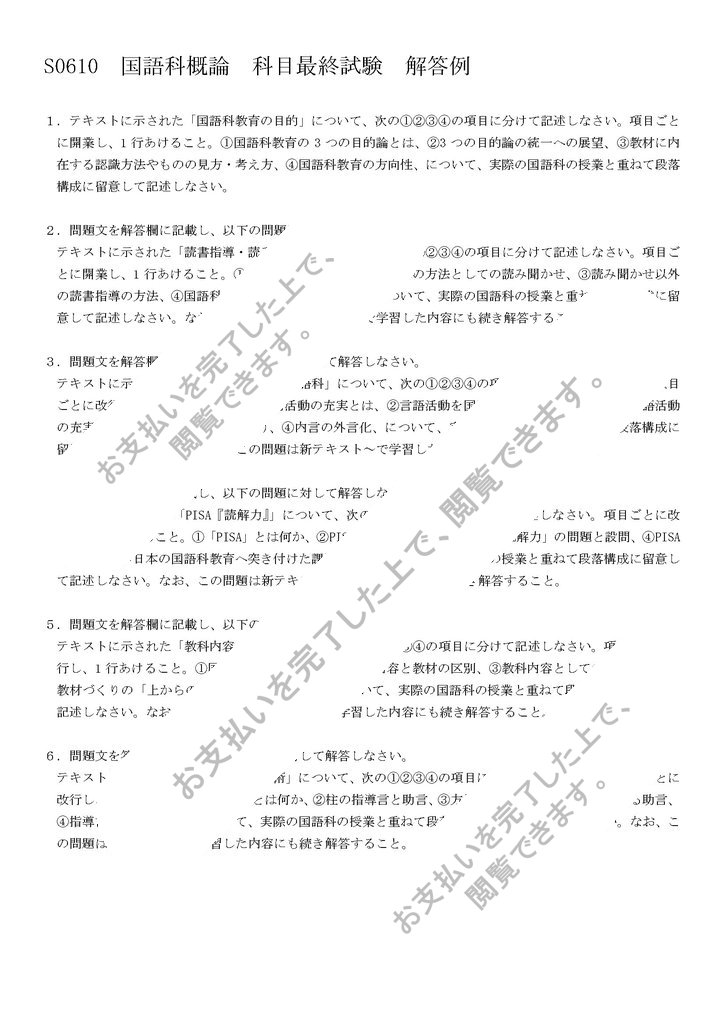 S0610 国語科概論の科目最終試験の6題の解答例です。