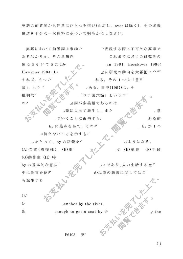 設題:「英語の前置詞から任意にひとつを選び(ただし、overは除く)、その多義構造を十分な一次資料に基づいて明らかにしなさい。」