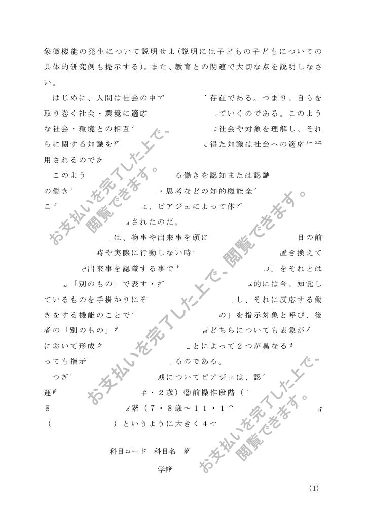 『象徴機能の発生について説明せよ(説明には子どもの子どもについての具体的研究例も提示する)。また、教育との関連で大切な点を説明しなさい。』