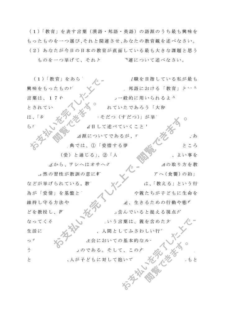 (1)「教育」を表す言葉(漢語・邦語・英語)の語源のうち最も興味をもったものを一つ選び、それと関連させ、あなたの教育観を述べなさい。