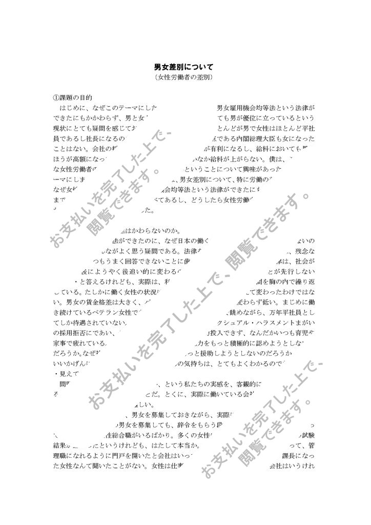 はじめに、なぜこのテーマにしたかというと、僕は、男女雇用機会均等法という法律ができたにもかかわらず、男と女とでは社会的にはどうしても男が優位に立っているという現状にとても疑問を感じております。会社では上司のほとんどが男で女性はほとんど平社員であるし社長になるのも男ばかりである。政府の頂点である内閣総理大臣も女になったことはない。会社の採用においても女より男のほうが有利になるし、給料においても男のほうが高額になっていくのに対し女のほうはなかなか給料が上がらない。僕は、このような女性労働者の差別がなぜ起こっているのかということについて興味があったのでこのテーマにしました。この文献を選んだ理由は、男女差別について、特に労働の差別について、なぜ女性労働者の状況が、男女雇用機会均等法という法律ができたにもかかわらず、いつまでたっても変わらないのかを述べてあるし、どうしたら女性労働者の差別がなくなるのかも述べてあったので選びました。